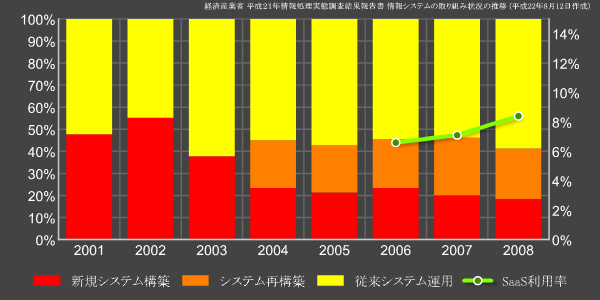 ※講演資料の抜粋: 経済産業省の統計では企業における情報システムへの取り組みのおよそ半分が、新規システム構築とシステム再構築(グラフ左)になっており、定常的な情報システムの改善・改修が行われていることが見てとれます。このような環境下でクラウド・コンピューティングによるシステム構築等の短縮は、極めて経済的な効果が高いと予測されています。また企業におけるSaaS(Software as a Service)利用率の伸びから、企業外部サービスやシステムを利用することへの抵抗感は薄れてきていることも読み取れます。ここから判断する未来像としては、パブリック・クラウドに代表される企業の外部にシステムが存在する状況も着実に拡がってくることと予測されています。
