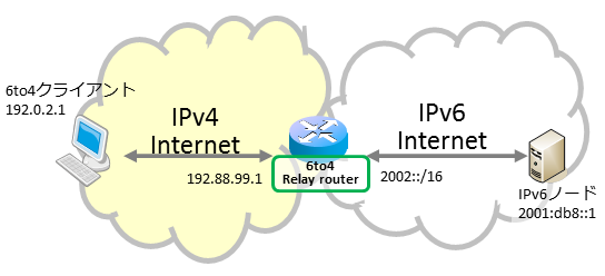 6to4リレールータは、IPv6インターネットから2002::/16宛てのパケットを受け取り、IPv6アドレス中に埋め込まれているIPv4アドレスを取り出し、そのIPv4アドレス宛にトンネルしたパケットを送信します。そのため、IPv4グローバルアドレスが必要となります。