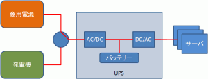 UPSの入力には、商用電源や発電機を接続します。通常時は商用電源から電力を受け、これが停電した場合に発電機へ切り替えるスイッチを備えるようにします。すでに述べたとおり、発電機の起動には時間がかかりますから、これを待つ間バッテリーから電力を供給します。バッテリーからの電力は直流ですので、これを交流に戻してサーバ等へ流すことになります。UPS内部で直流にしている理由は、バッテリーへの充電が必要であるためでもあるのですが、入力からバッテリーへの切り替えが無停電で行えるという利点もあります。さらに、直流をインバータで交流にするため、電圧や周波数を一定に保つことができるというメリットもあります。