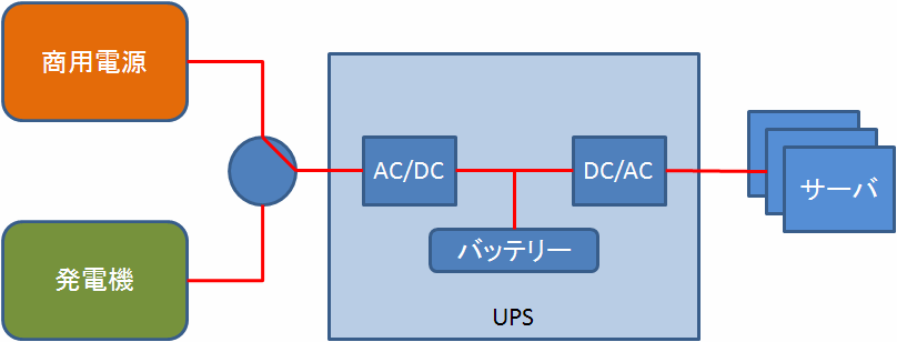 そこでデータセンターでは、商用電源や発電機の回路を直接サーバやラックにつなぐのではなく、UPSを使って電力を供給するようになっています。