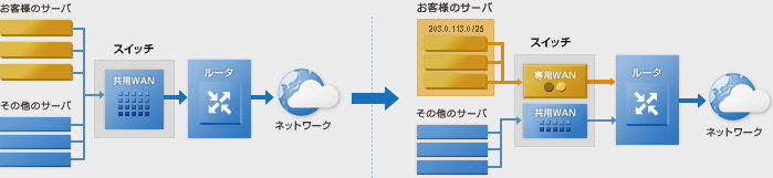 ・「専用グローバルネットワーク」をご利用の場合は必ず本サービスで提供するサブネット内のIPアドレスへの切り替えが必要となり、サーバ初期提供時に標準付帯されているIPアドレスを同時にご利用いただくことはできません。