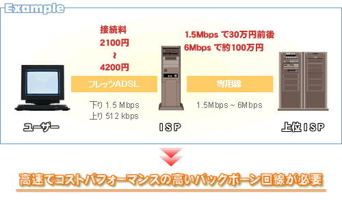 現在ユーザーのインターネット環境はADSL等の普及が進み、安価で高速な回線が利用できるようになっています。一方ISPに提供されるバックボーン回線は、帯域・価格共にADSL普及以前と変わっていません。バックボーン回線の調達がままならない現状では、ブロードバンド対応が非常に困難です。