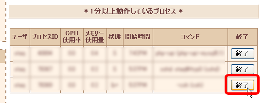対象となるプロセスを確認し、右側にある終了ボタンを押下します。→図3