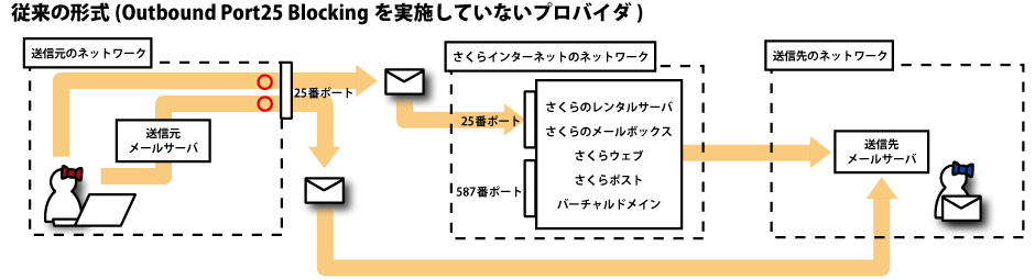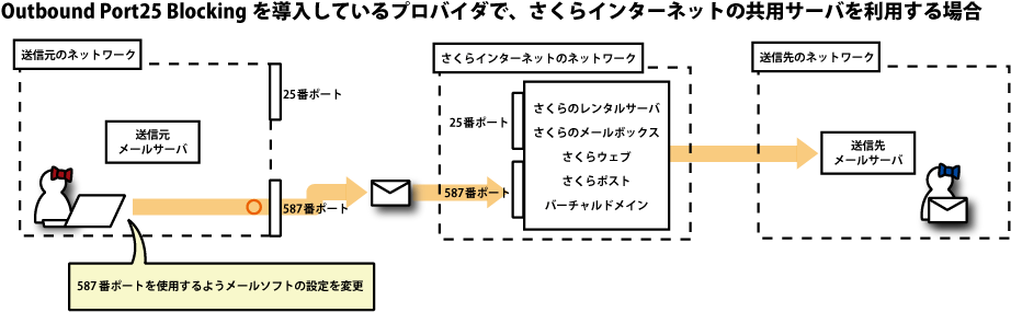最近、弊社サポートへ「メールの送信が急にできなくなった」、「一定数のメールを送信すると、タイムアウトエラーが発生する」といった旨のお問い合わせをよくいただきます。 「さくらのレンタルサーバ」、「さくらのメールボックス」では25番ポート(SMTPポート)の代替として、587番ポート(サブミッションポート)をご利用いただけるよう設定いたしております。