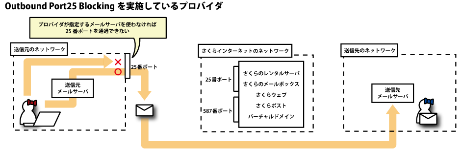 インターネットでは数年前から迷惑メール(スパムメール)と呼ばれる、「不特定多数に対する受け取りを希望しないメールの送信」が流行しております。 このような背景から、Outbound Port 25 Blockingという手法を用いて、 迷惑メール送信対策を実施されるISP(インターネットサービスプロバイダ)様が 増えております。