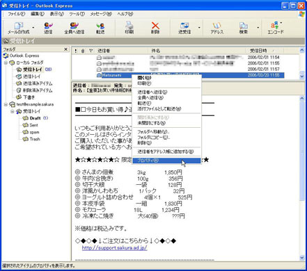 OutlookExpressを起動後、対象のメールを一覧から選んだ状態で右クリックし