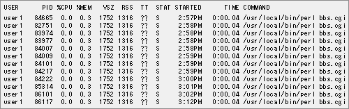 レポートの例では、bbs.cgiというプログラムが大量に動作しており、これが問題となっているということがわかります。