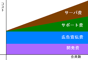 このうち、ユーザの数と関係なくかかるのが広告宣伝費と開発費で、ユーザの数に連動するのはサーバ費用と課金手数料、サポート費用です。