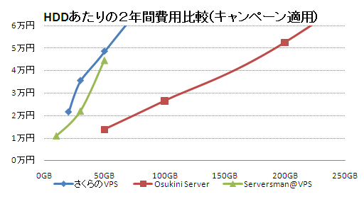 例えば、1万円の場合にさくらのVPSは20GB、Serversman@VPSは30GBのところ、Osukini Serverは50GBと大幅に大きいことがわかります。