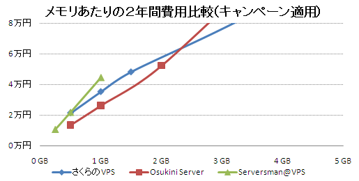 低スペック帯では唯一256MBモデルを出しているServersman@VPSが安価であり、512MBあたりでは3社とも同様の価格となり、高スペック帯ではさくらのVPSがもっとも安価ということがわかります。