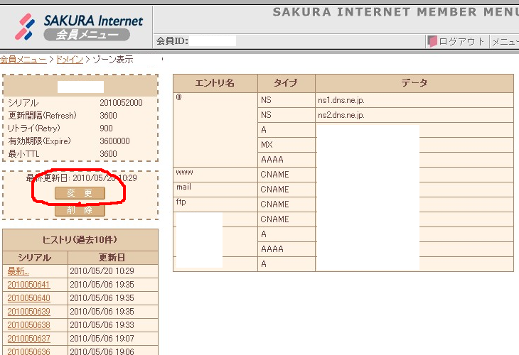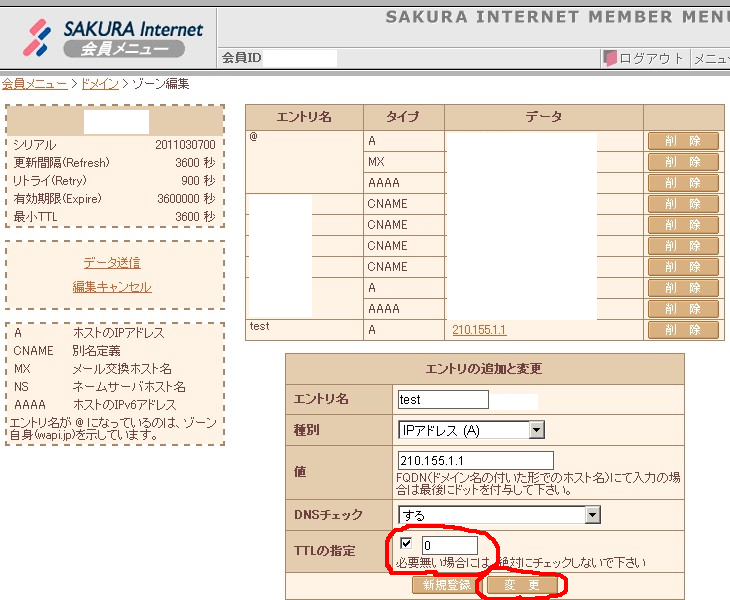変更したいエントリーのデータをクリックし、フォームにおいてTTLを入力して、「変更」ボタンをクリックします。