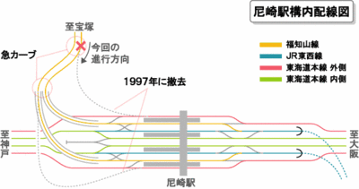 まず、上の図を見てください。現在の尼崎駅構内配線図と、福知山線のアプローチをまとめたものです。
