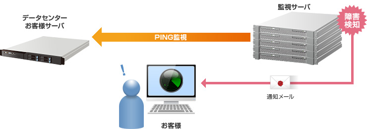 PING監視とは、24時間お客様のネットワークを監視し、迅速に異常を検知するものです。サーバに対しさくらインターネットがPING、TCPポートの接続確認を行うことで、トラブルの兆候を見逃しません。障害検知時には、迅速にお客様の携帯電話へメール通知することにより、サーバ管理コストを大幅に削減します。