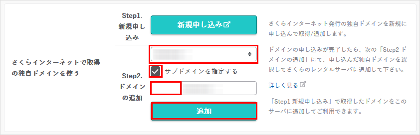 3「さくらインターネットで取得の独自ドメインを使う」のプルダウンメニューから、設定したいドメイン名を選び、『追加』をクリックします。