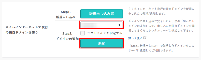 3「さくらインターネットで取得の独自ドメインを使う」からドメインを選択し、『追加』をクリックします。