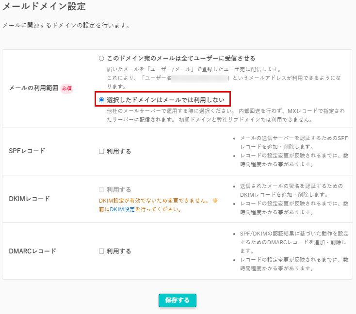5「メールの利用範囲」の『選択したドメインはメールでは利用しない』にチェックをいれます。