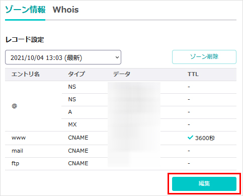 2ゾーンの情報(Whois)の、『編集』をクリックします。