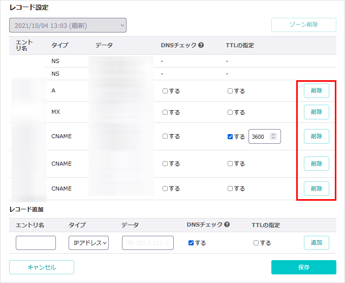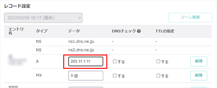 エントリ名「@」値に「NSレコード」を入力し新規登録された場合、個別削除ができず一度設定の全削除をしていただき、改めて個別の設定を登録していただく必要がございますので、決して登録されないようお気をつけください。