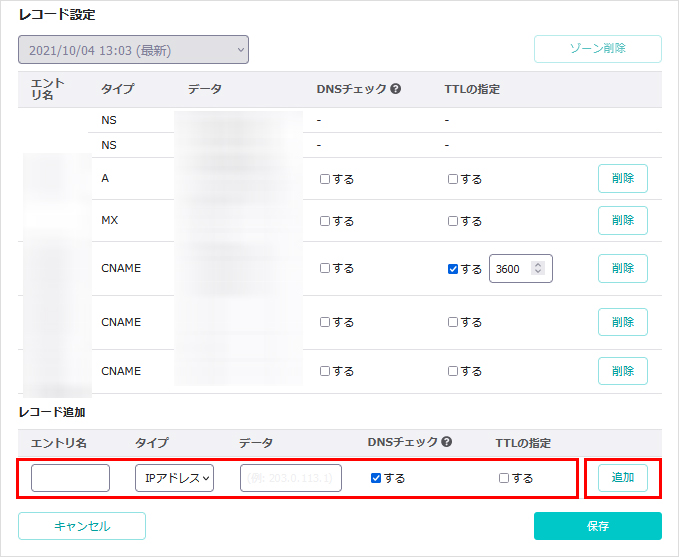 1さくらのDNS設定(詳細設定)の『追加して設定』をクリックします。