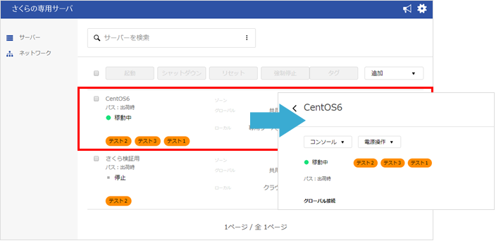 2サーバー一覧画面にて対象サーバーを選択し、サーバー詳細画面へ表示を切り替えます。
