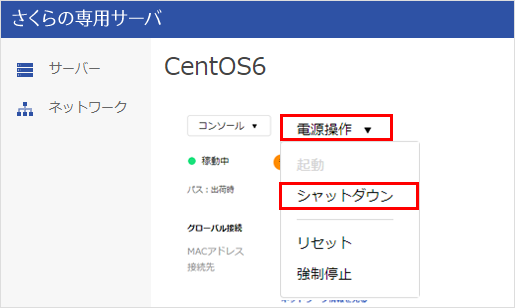※ 『シャットダウン』でサーバーが停止しない場合は、『強制停止』の実施をお試しください。