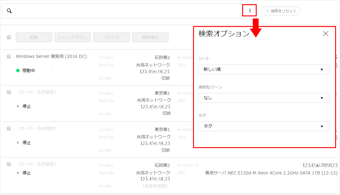 2ソートの枠内にある「▼」をクリックすることで選択肢が表示されます。 選択した項目に該当するサービスのみが表示されます。