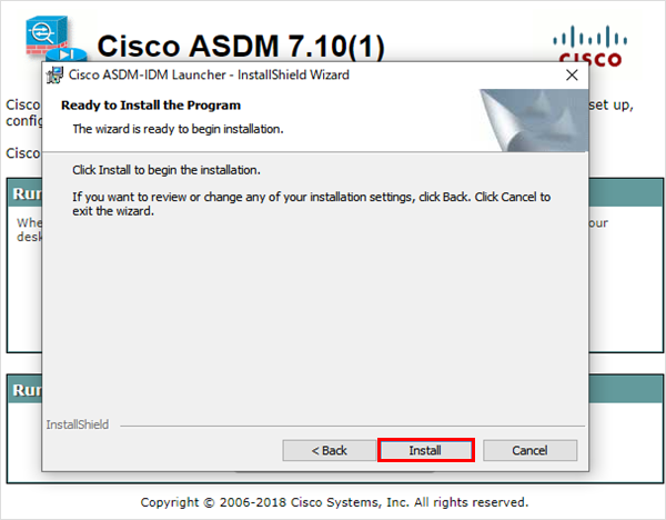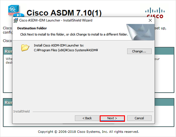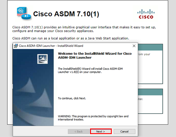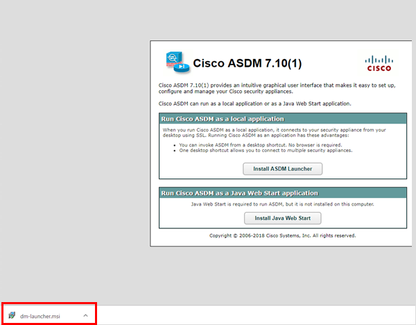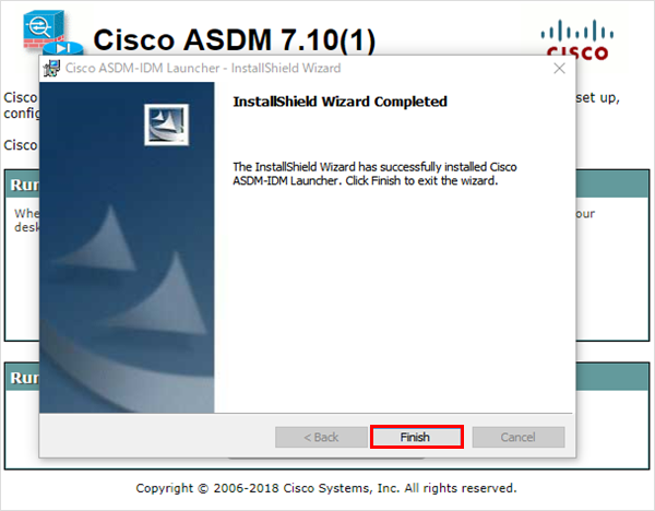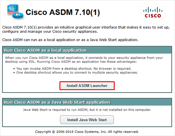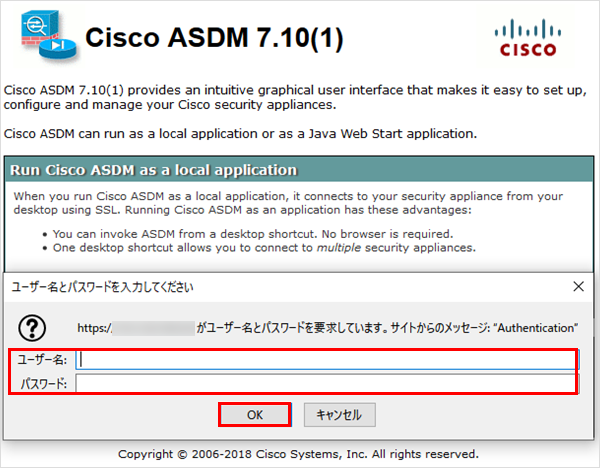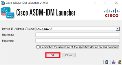 8インストール後にローカルパソコンから「Cisco ASDM-IDM Launcher」を起動します。※Windows10より Cisco ASDM-IDM Launcher が実行できない場合は