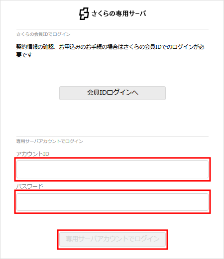 2「専用サーバアカウント」でログインする場合は、「アカウントID」「パスワード」を入力し、 『専用サーバアカウントでログイン』をクリックします。