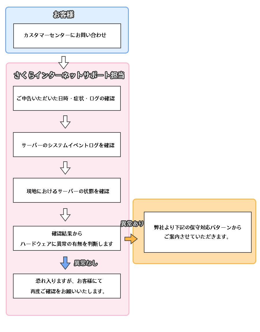 サーバーに異常が見られた場合は、通常以下の流れで復旧までの対応をさせていただきます。