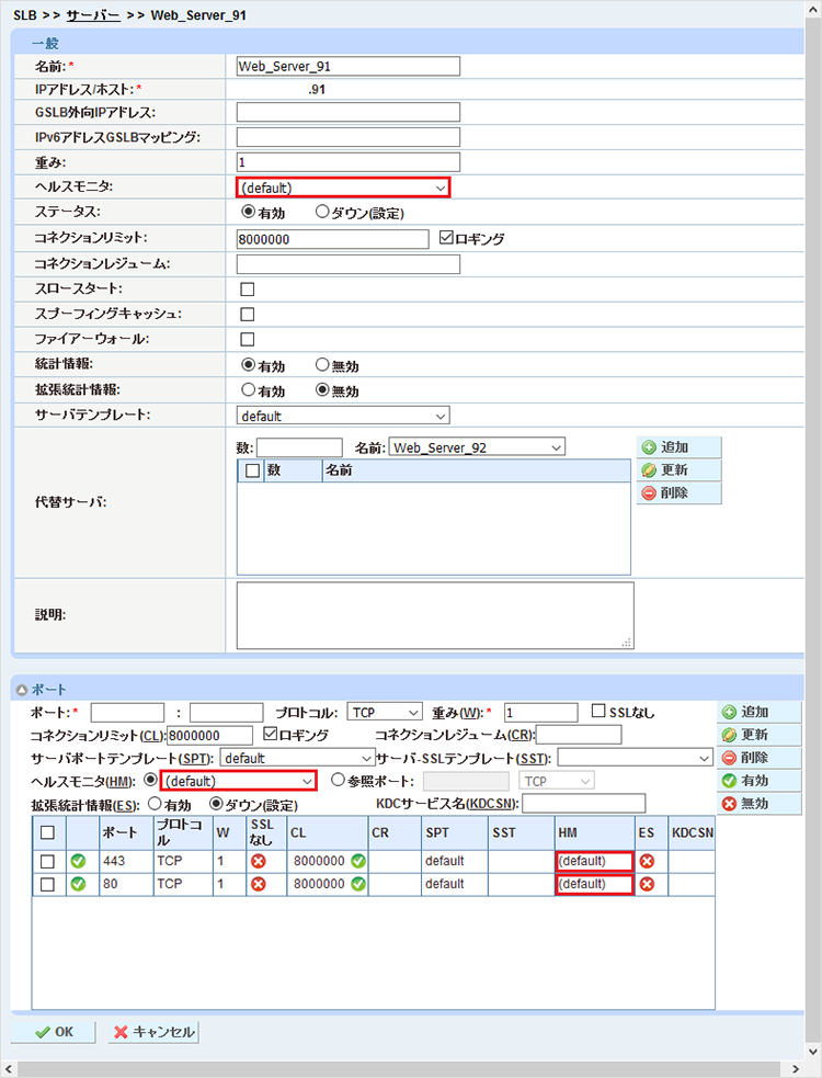 - リアルサーバーの「ポート」項目のヘルスモニタ