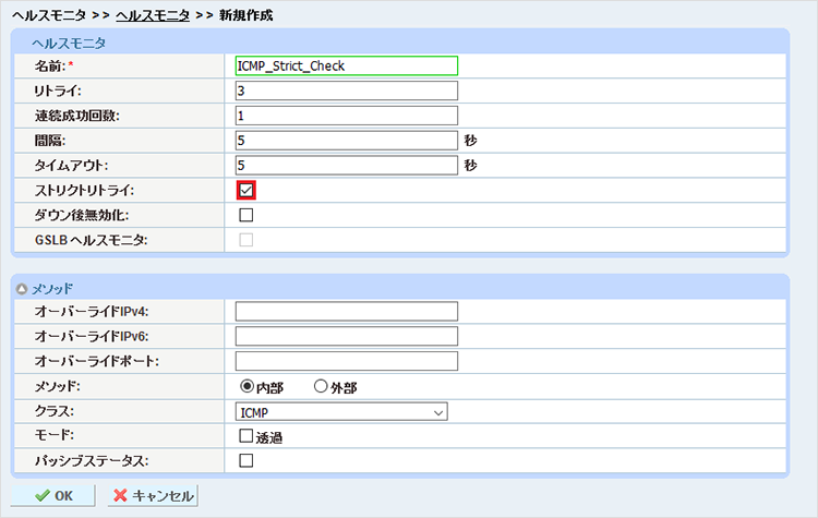 - 「ヘルスモニタ」項目で「名前」欄、「リトライ」欄、「間隔」欄、「タイムアウト」欄を入力します。