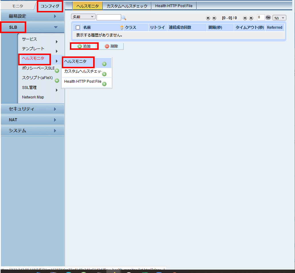 - [コンフィグ] > [SLB] > [ヘルスモニタ] > [ヘルスモニタ]と遷移し一覧を開きます。