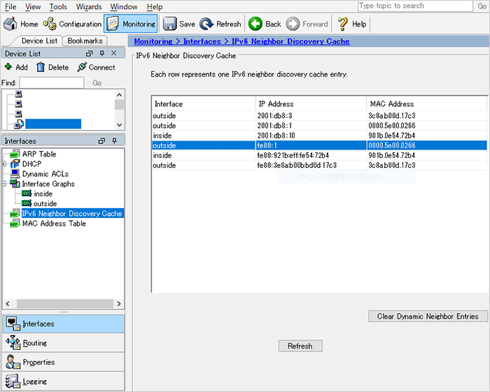 メインメニューから [monitoring] をクリックします。左メニューの [Interface] をクリックします。 [Interface] メニュー中の [IPv6 Neighbor Discovery Cache] をクリックします。 IPv6デフォルトゲートウェイ(fe80::1)の仮想MACアドレス(例示では 0000.5e00.0266)を確認します。