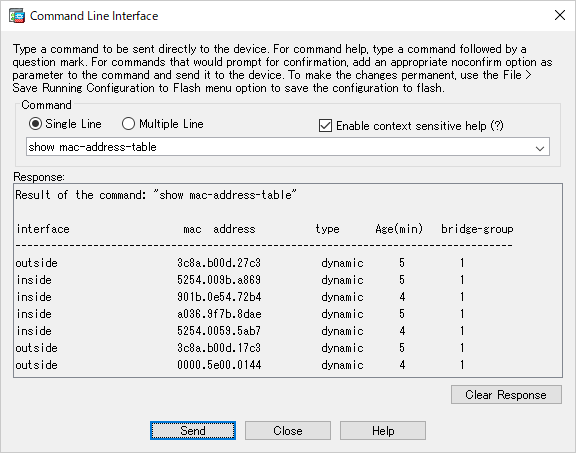 # show mac-address-table interface mac address type Age(min) bridge-group ----------------------------------------------------------------------------------- inside 901b.0e54.72b4 dynamic 1 1 inside a036.9f7b.8dae dynamic 5 1 outside 3c8a.b00d.17c3 dynamic 5 1 outside 0000.5e00.0144 dynamic 3 1