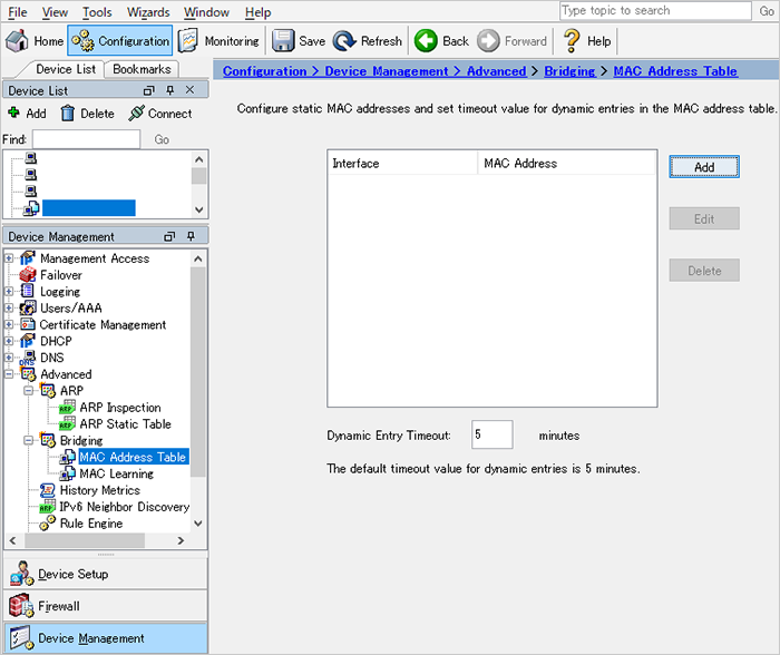 [Device Management] メニュー中の [Advanced] -> [Bridging] -> [MAC Address Table] の順にクリックします。
