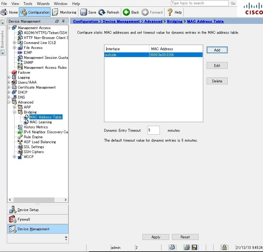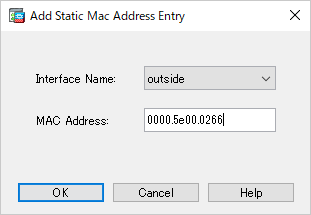 [Add Static Mac Address Entry] の画面となるので [Interface Name] で outside を選択します。