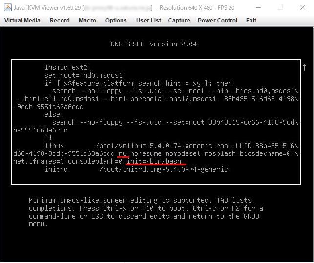 5linux行のroをrwへ書き換え、行末にinit=/bin/bashを追記のうえ、[Ctrl]+[X]キーを押しOSを起動します。