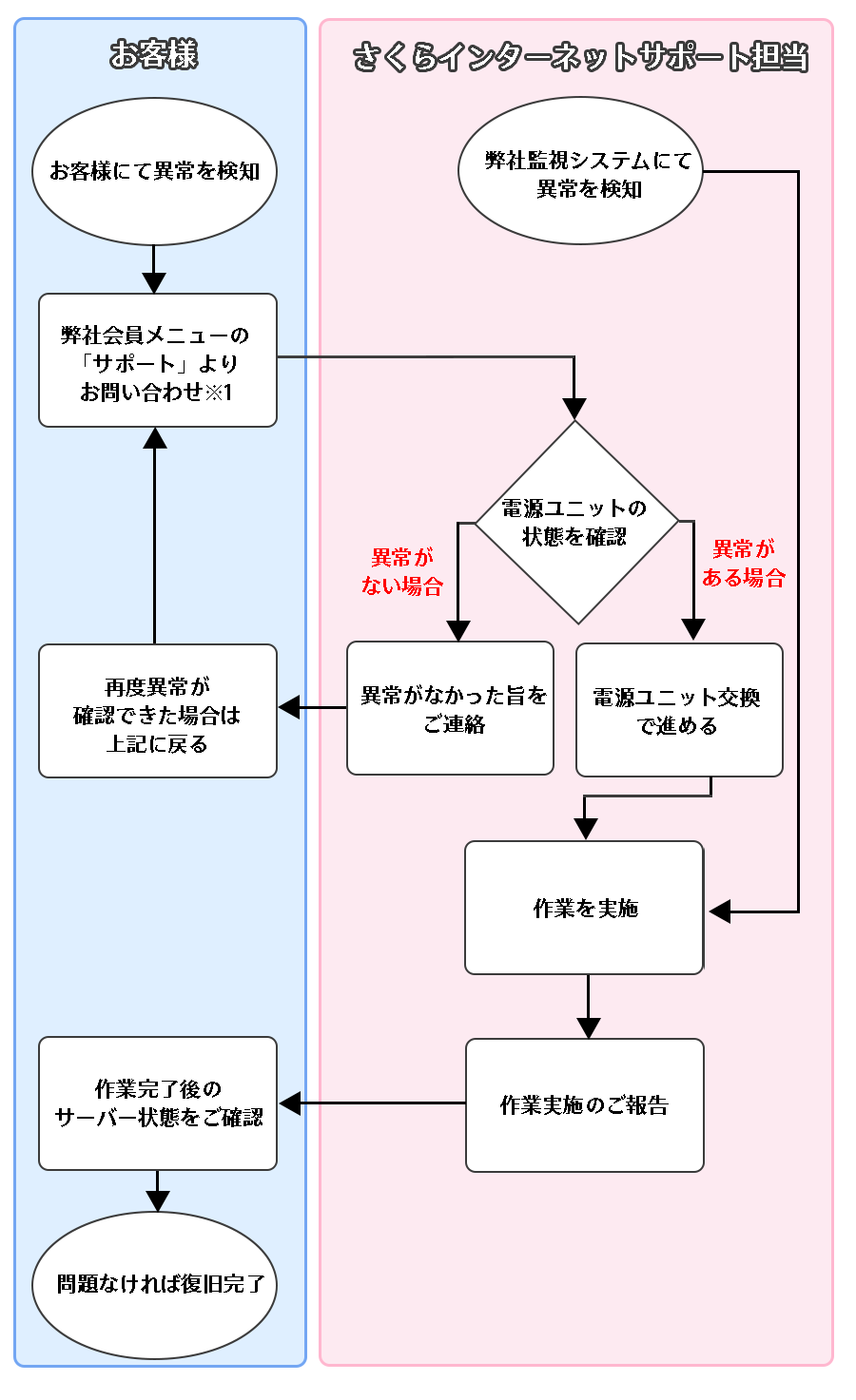 電源ユニット交換作業では、異常を検知した電源ユニットを正常な電源ユニットに交換いたします。弊社監視システムにて異常を検知後、ベストエフォートで交換対応を行い作業完了後にお客様へご連絡いたします。
