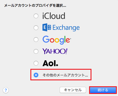一番下の『 その他のメールアカウント 』を選択し、『 続ける 』をクリックします。
