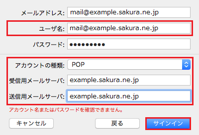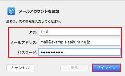 以下項目を入力し、『 サインイン 』をクリックしますと、アカウントの追加が完了します。