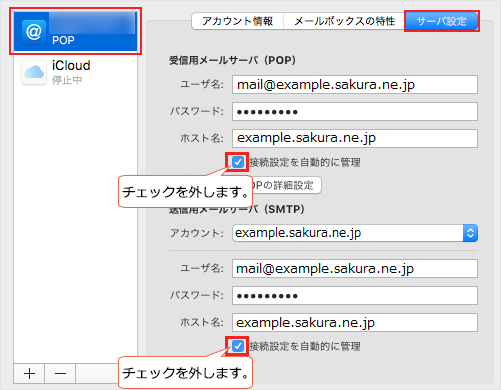 【 サーバー設定 】タブをクリックし、[受信用メールサーバー(POP)]と[送信用メールサーバー(SMTP)]の箇所にある『 接続設定を自動的に管理 』のチェックを外します。