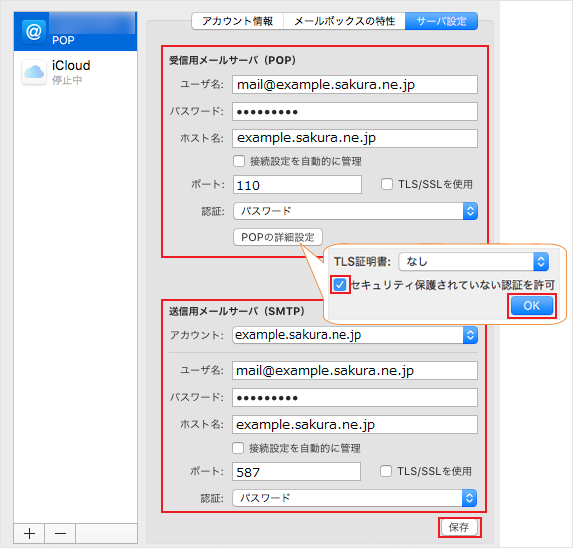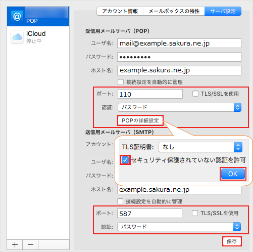 POPの詳細設定 クリック後、「セキュリティ保護されていない認証を許可」にチェックを入れる