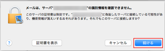 「このメールは、サーバー”○○”の識別情報を確認できません。」と記載された画面が表示された場合右下にある『 続ける 』をクリックしますと、次へ進むことができます。
