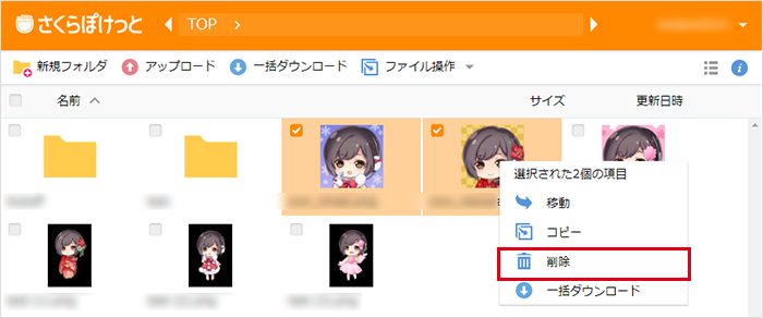 ファイルを複数選択し、右クリックでメニューを出して削除を選択する。