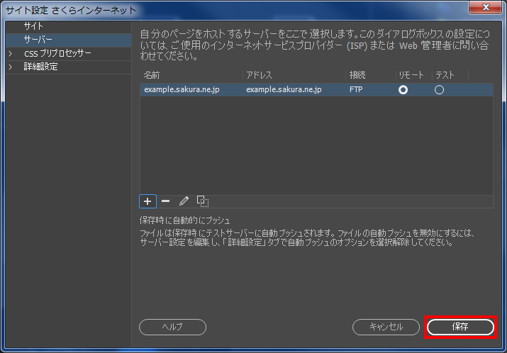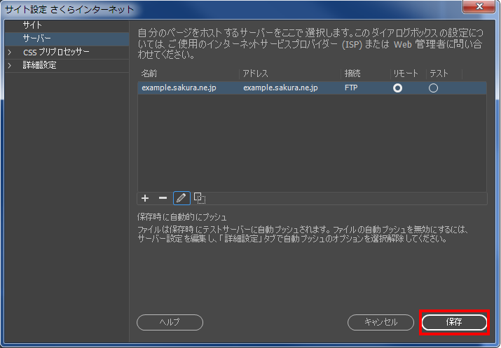 5ご利用サーバーの情報を入力し、『 保存 』をクリックします。