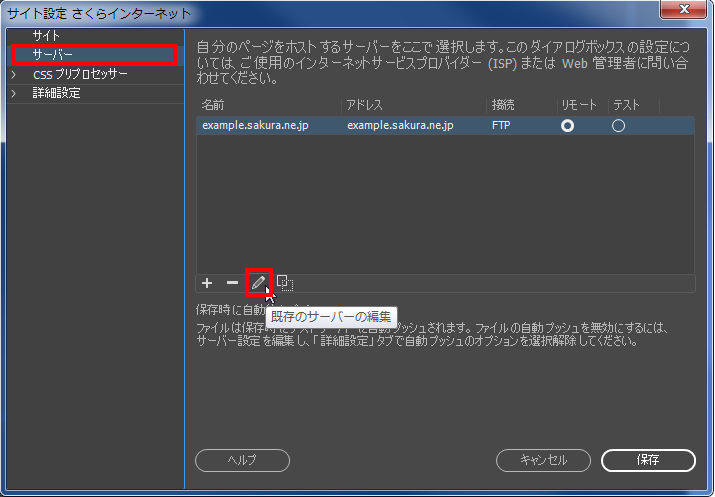 5左枠の「 サーバー 」をクリックします。変更したいサーバを選択し、『 既存のサーバの編集 』ボタンをクリックします。