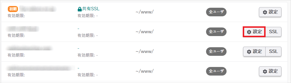 3SSL設定を設定するドメイン名の右側にある『設定』をクリックします。