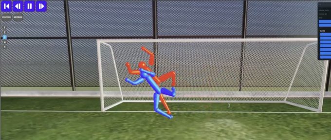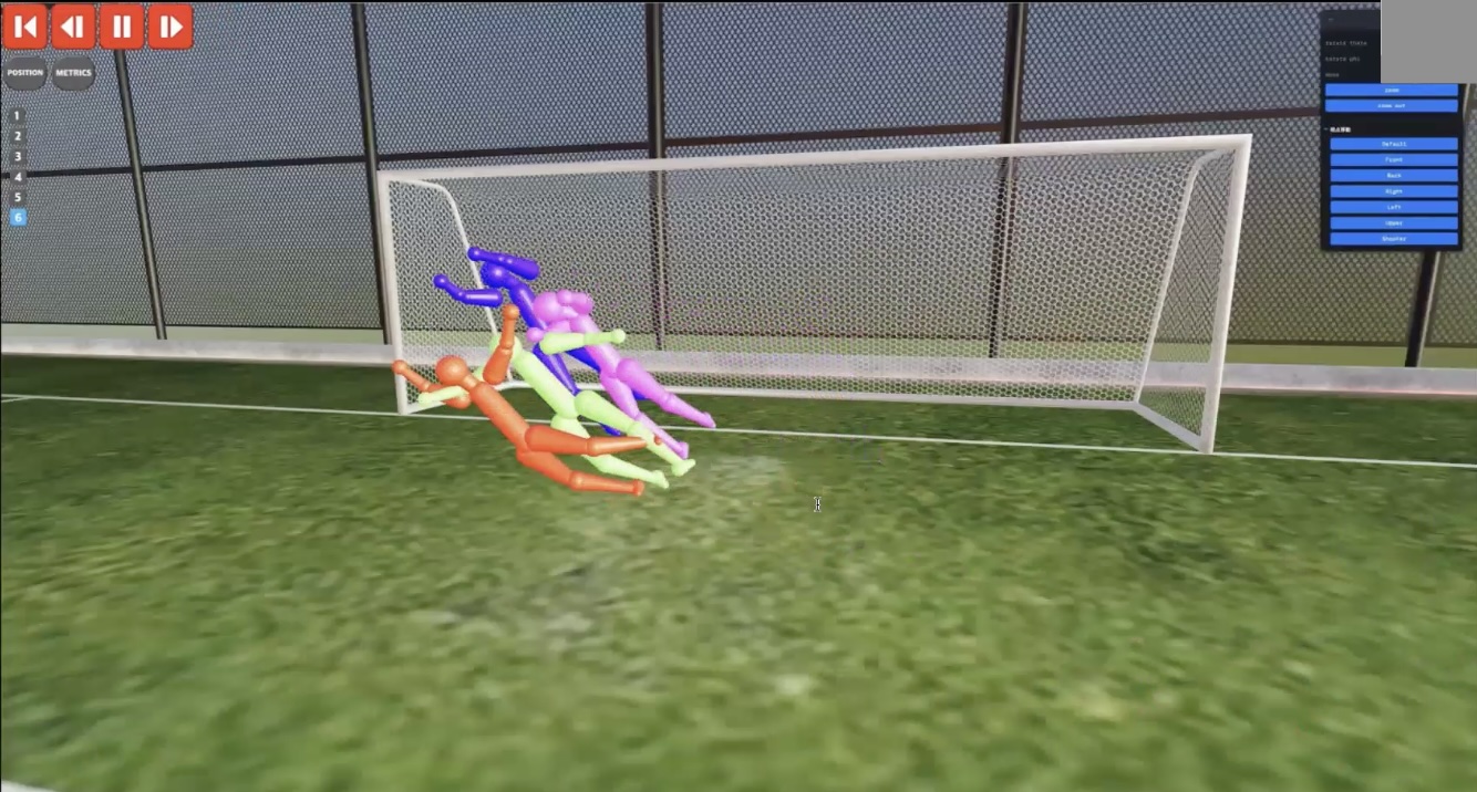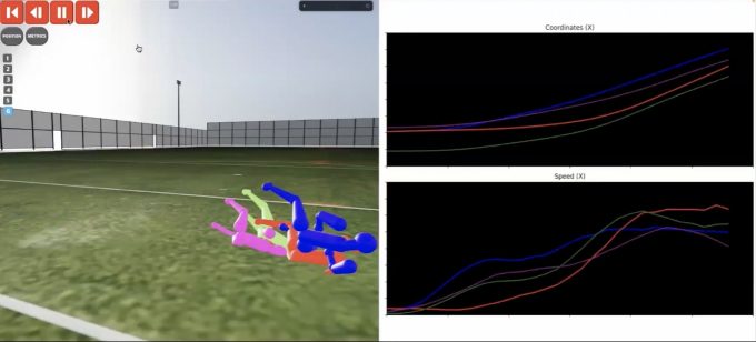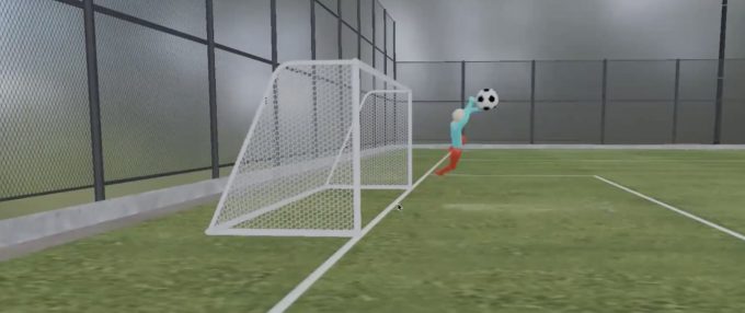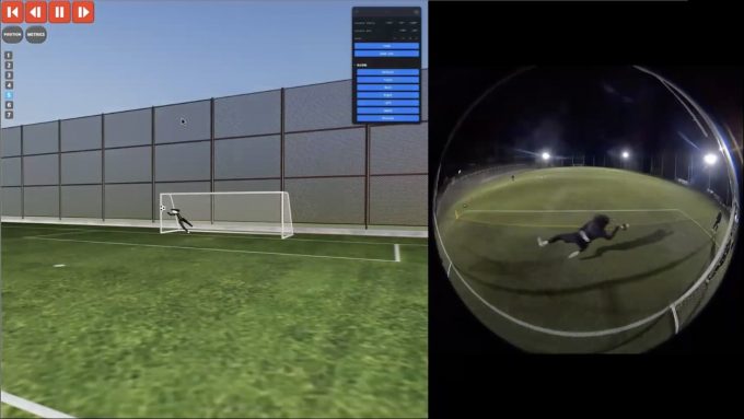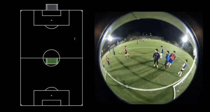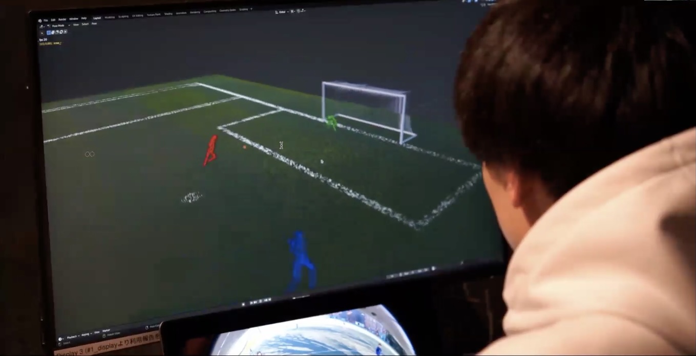 先ほど述べた通り、練習でデータを取得する際には、多様な練習設定に対応していく必要があります。例えば練習中に大きくゴールを動かしてピッチサイズを変えて練習を行う場合でも、これまでと同じように2つのカメラで動画を撮影して推論を行うことで、ゴールを動かしていない場合と同じように、正確に3DCGを生成することが可能です。先ほどと同じように、この3DCG上でも自由な視点からプレーを振り返ることができます。