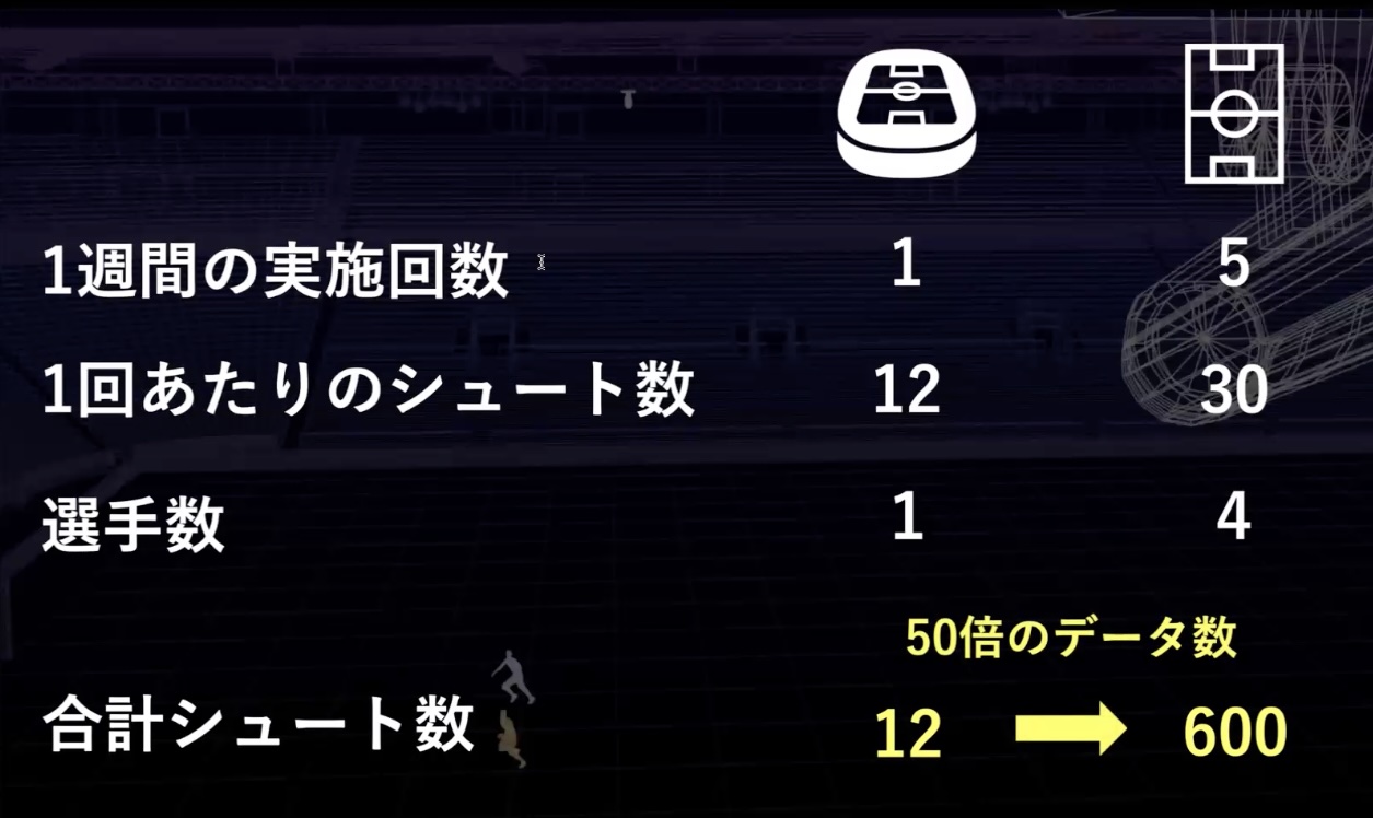 さらに実際の選手のプレー回数を考えてみると、1週間のうちほとんどの時間は練習に費やしています。ボールに触る回数やシュートの回数も練習の方が圧倒的に多く、さらに練習であればレギュラーの選手も控えの選手も同じようにプレーをすることができます。特にゴールキーパーに関しては、試合中に交代することがほとんどないので、試合で取れるデータはレギュラー選手のみのデータになってしまうという問題があります。これらを鑑みると、練習で取得できるプレーデータの量は、試合で取得できるデータ量の実に50倍ぐらいになると考えられます。