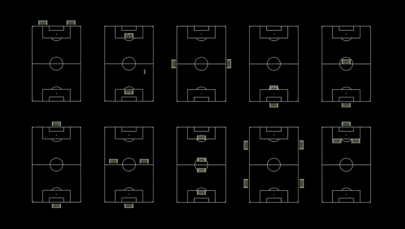 まず練習の多様性についてです。サッカーの練習はさまざまな形状のコートで行われます。同じ日の練習でも、ゴールを横に2つ並べて練習したり、その直後の練習ではゴールを動かして対面させ、ミニゲーム形式で練習をしたりします。このようにさまざまに変化する練習環境に対して、既存のデバイスでは安定してプレイデータを取得することは非常に難しいです。